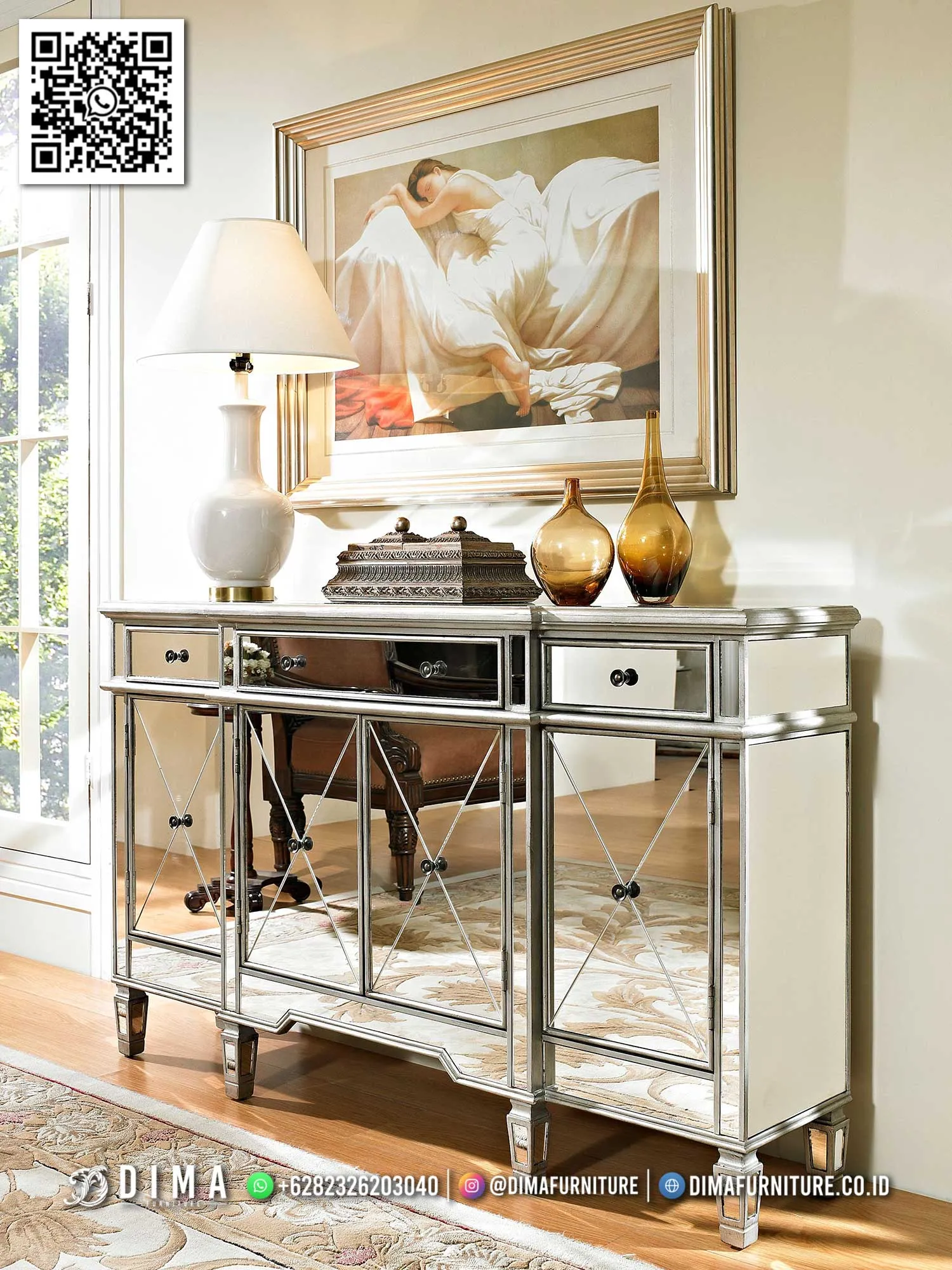Meja konsol klasik sangat pas untuk Anda yang ingin menampilkan kesan megah dan timeless. Biasanya menjadi focal point di area foyer, ruang tamu, atau lorong utama.