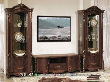 Bufet TV jati mewah set lemari hias Winston dengan desain klasik elegan. Cocok untuk ruang keluarga, kuat, rapi, kesan interior berkelas.