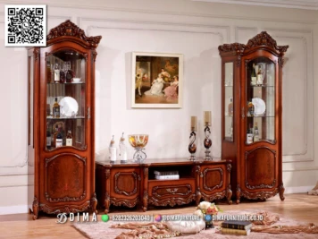 Lemari pajangan klasik mewah jati grand imperial dengan desain elegan dan ukiran halus, cocok untuk ruang tamu berkelas dan interior klasik.