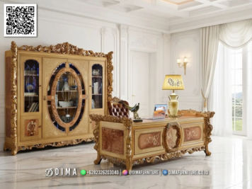 Meja kantor ini hadir dengan detail ukiran yang rumit namun tetap menawan, menghadirkan kesan mewah tanpa berlebihan. Perpaduan gaya klasik dan nuansa emas membuat meja terlihat seperti furnitur kerajaan. Sangat cocok digunakan sebagai meja kerja direktur, meja kantor eksekutif, atau meja ruang kerja pribadi yang ingin tampil lebih berwibawa.