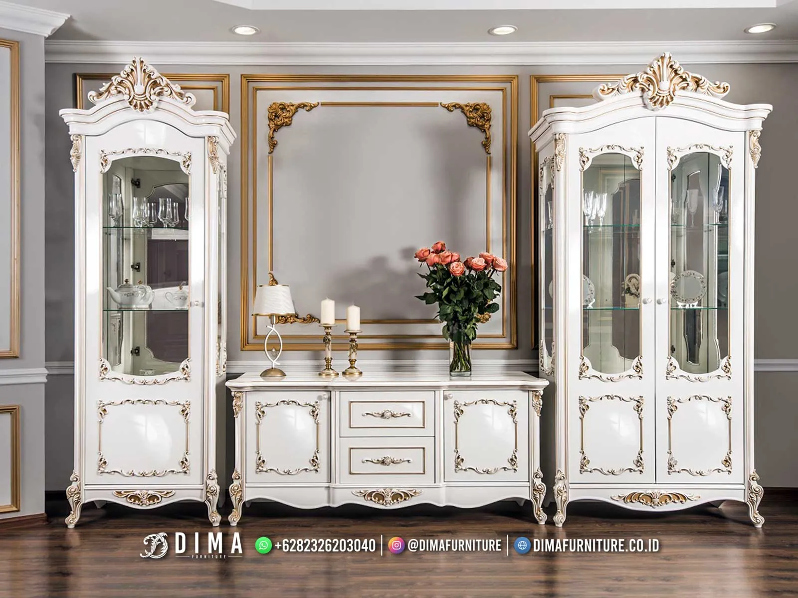 Set bufet tv furniture lemari hias mewah jepara ivory hadir dengan desain klasik elegan, warna ivory lembut, kokoh, dan rapi.