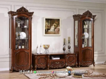 Set bufet tv & lemari pajangan jati solid natural dengan desain klasik elegan, kuat dan awet. Cocok untuk ruang tamu agar tampil rapi dan berkelas.