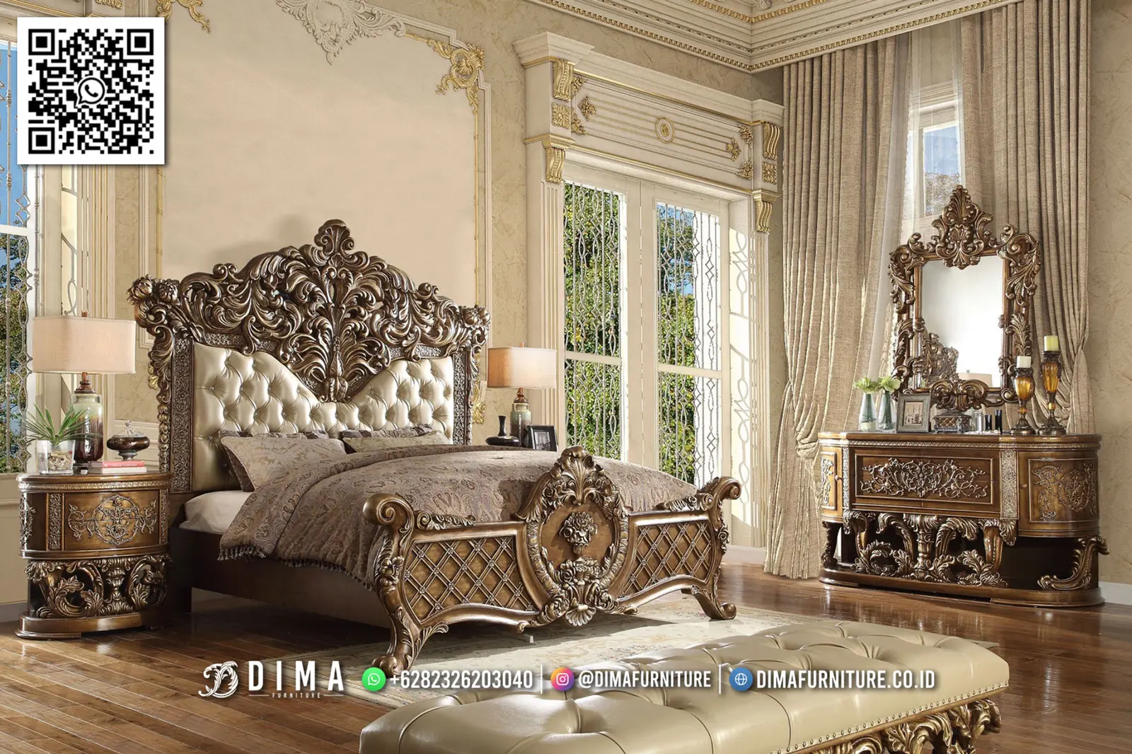 Produk set kamar tidur mewah ini dibuat dari material kayu solid berkualitas tinggi, yang pastinya kokoh dan awet. Setiap detail ukiran gold pada furnitur dikerjakan oleh pengrajin profesional yang sudah berpengalaman. Hasilnya, setiap ukiran terlihat rapi dan presisi, memberikan kesan mahal pada setiap bagiannya.