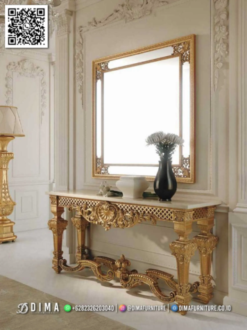 Set meja konsol gold mewah dengan ukiran elegan gaya eropa ini menghadirkan pesona klasik yang menawan, sempurna untuk memperindah tampilan rumah anda.